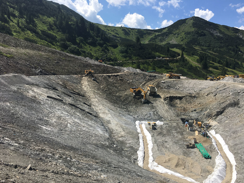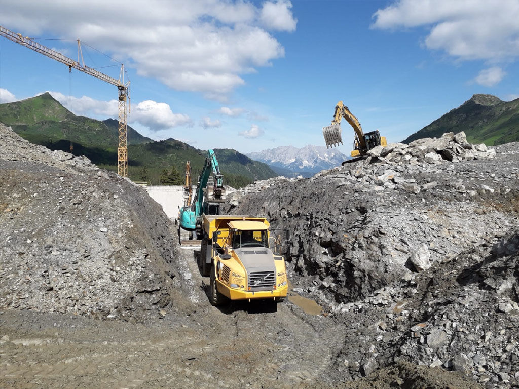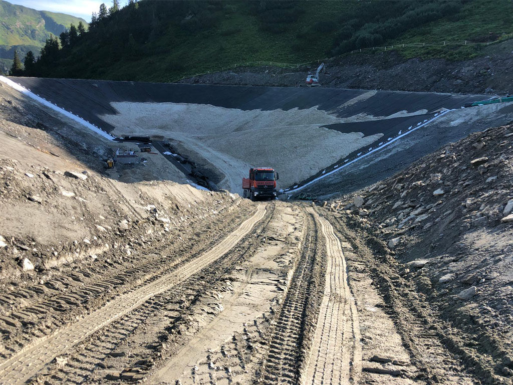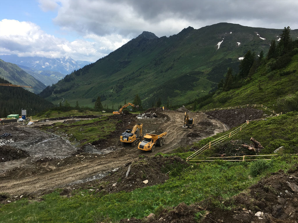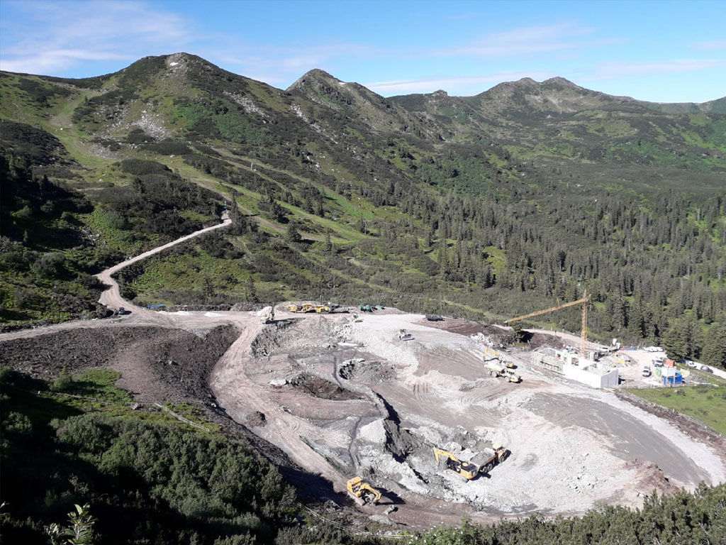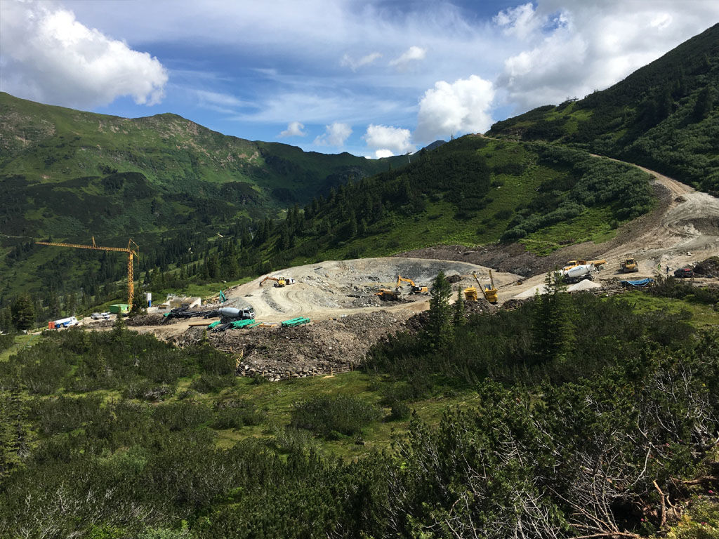des Speichers Planneralm mit V- 50.000 m³. Die Bauarbeiten erfolgen grossteils durch GPS gesteuerte Baumaschinen der neuesten Generation wodurch eine effiziente Baudurchführung gewährleistet ist.