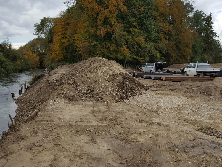 Der Hochwasserschutz am Triftbach wird mit einer Stahlspundwand mit aufgesetztem Stahlbeton-Kopfbalken hergestellt.